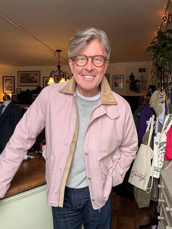Pink. Spring-like. Barbour. Colour. Hibernation in reverse. Avenues and Alleyways. See Through. Drakes. John Smedley. Derbyshire. Worldly wise. Pompeii. Tony Curtis and Roger Moore. Knocking out a tune. Risk averse. Edwin Denim. Sunshine. Queenie & Beatrice. Bedale. Good food and exercise. Boot of the car.