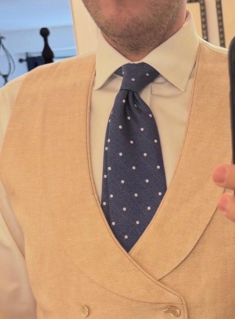 I’m getting married this May in Bogotá, Colombia, and I’ll be wearing morning dress (photo attached). I wanted to ask your view on the combination I’m planning: a white shirt, double-breasted buff waistcoat, and a light blue tie with white polka dots (see other photo).